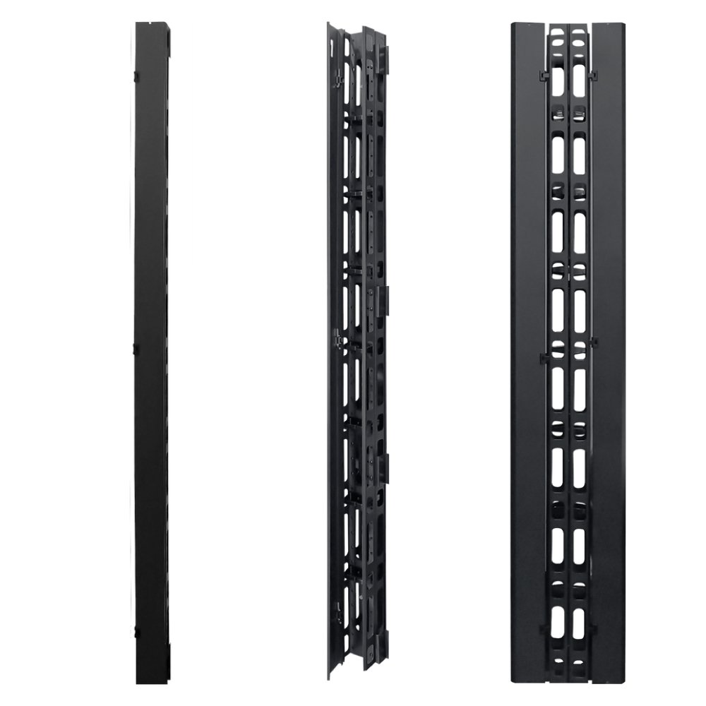 Rack Vertical Cable Manager (VCNB-3X3X74D) Routing your cables through a panel reduces the tension that's often put on cables. This prevents cable damage or connection loss, and reduces strain on equipment ports, preventing damage to your expensive rack-mounted devices.The double‐sided 74” cable manager offers versatile installation options and is compatible with most racks that are 45U or larger. The panel features a 0U design that doesn’t take up any mounting space, and with simple installation, it's easy to attach or reposition as necessary.Properly routing cables also improves airflow, which passively cools devices stored in your rack, helping to keep your equipment running at optimal temperatures to reduce the probability of damage caused by your rack overheating.The cable manager runs vertically along the side of your rack, to neatly guide cables between equipment that’s mounted at different heights. This provides a tidy and well-organized way to run cables from devices mounted toward the bottom of your rack to other devices mounted near the top, without leaving a mess of cables hanging in between.Features:One continuous hinged cover provides quick access to cableIntegrated plastic cable rings for proper cable managementRear openings ideal for cable entry and exitAttached vertically onto the front or rear rails 2‐Post and 4‐ post 45U racksDimensions: 3.6” W x 6.0” D x 73.4” HEIA/ECA‐310‐E CompatibleMaterial: Cold Rolled SteelColor: BlackPackage Includes:1 x Single‐Sided 74” Vertical Cable Manager1 x Hinged Cover4 x Mounting BracketMounting hardware included