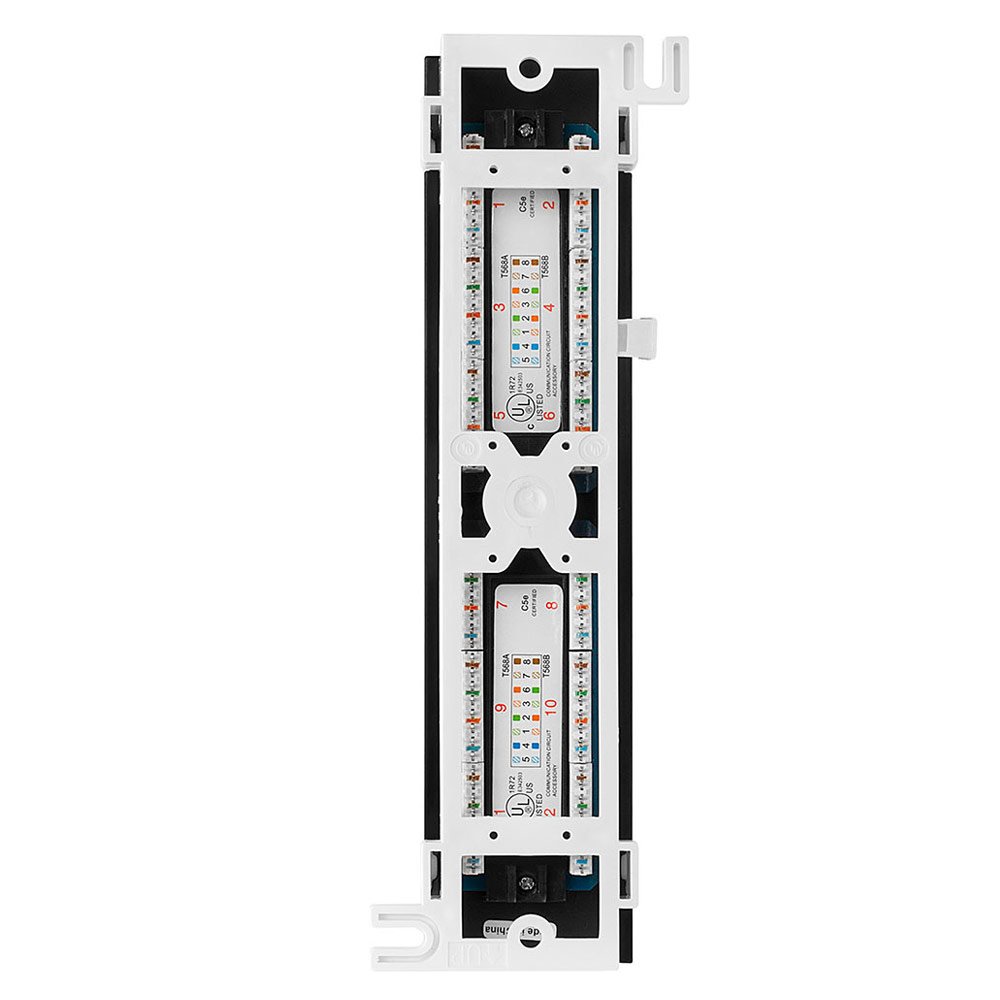 Compact vertical rack mountable 12 port Cat 5 / Cat 5e patch panel.Cmple 12-Port Mini Patch Panels provide technicians and premise network installers with the ultimate solution for expanding a network in locations where space is at a premium.These compact, wall mountable are compatible with both T568A and T568B wiring configurations to provide greater flexibility in accommodating any type of performance specification.Patch panels are used to connect & rout circuits. They are primarily used in computer networking but also in recording studios radio & television.Small footprint saves space and allows optimum use of valuable rack space. Conveniently numbered and writeable port labels on the front panel.Compatible with both 568A and B standards with easy to read color code diagrams in back. Takes standard 110 blade punch downs.Provides tight, secure, positive contact and transfer of signals. Bracket frame with screw eyelets for easy attachment to rack frame.Specifications:12 Port UTP CAT5e Wall-Mount Mini Patch PanelCompatible with both 110 and Krone punch down toolsT568A and T568B dual wiring options50 microns gold over nickel plating on contactsMeets or Exceeds ALL EIA/TIA StandardsSupports 22 to 26 AWG stranded and solid wireCompliance with the ANSI/TIA/EIA 568 B.2 standardFits into a tight network closet space